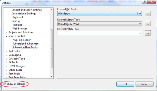 5. For External Diff Tool and External Merge Tool, choose Winmerge.